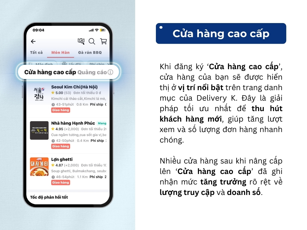 - Khi đăng ký ‘Cửa hàng cao cấp‘, cửa hàng của bạn sẽ được ưu tiên hiển thị ở vị trí đầu tiên, nổi bật trên trang danh mục của Delivery K. Đây là giải pháp tối ưu nhất để thu hút khách hàng, tăng lượt xem và số lượng đơn hàng một cách nhanh chóng.