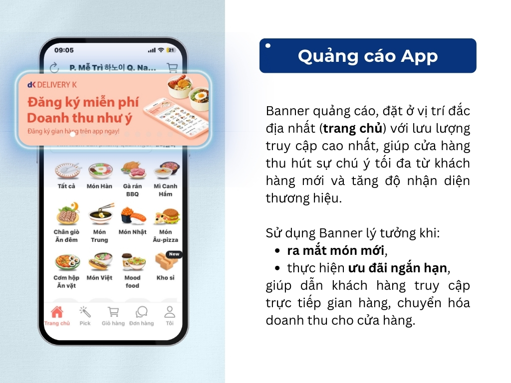 Banner quảng cáo là công cụ hiệu quả giúp cửa hàng của bạn thu hút sự chú ý tối đa của các khách hàng mới ngay từ cái nhìn đầu tiên. Banner được đặt ở vị trí đắc địa nhất trên ứng dụng – đầu trang chủ, nơi có lưu lượng người dùng cao nhất, rất lý tưởng khi cửa hàng: