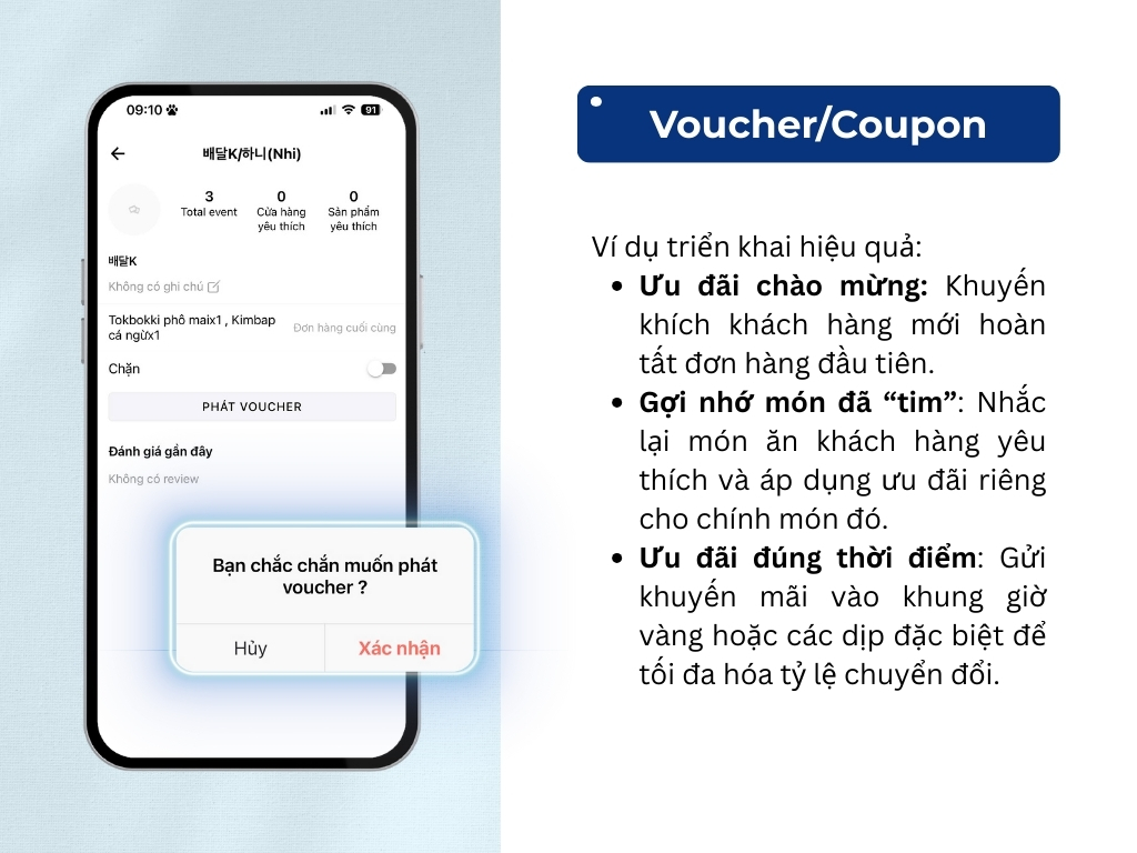 - Sử dụng voucher có thời hạn giới hạn để tăng đơn hàng vào các khung giờ vắng hoặc đẩy bán món mới hoặc món đặc biệt.