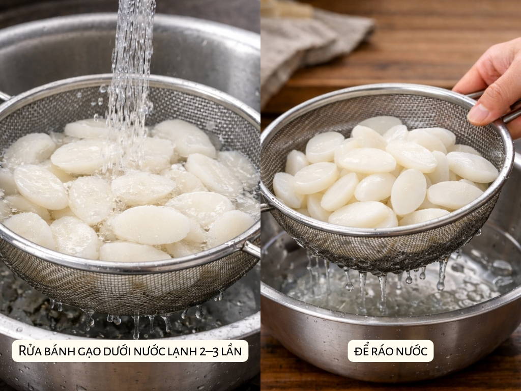 – Rửa bánh gạo dưới nước lạnh 2–3 lần để loại bỏ bớt tinh bột, giúp bánh không bị dính khi nấu.