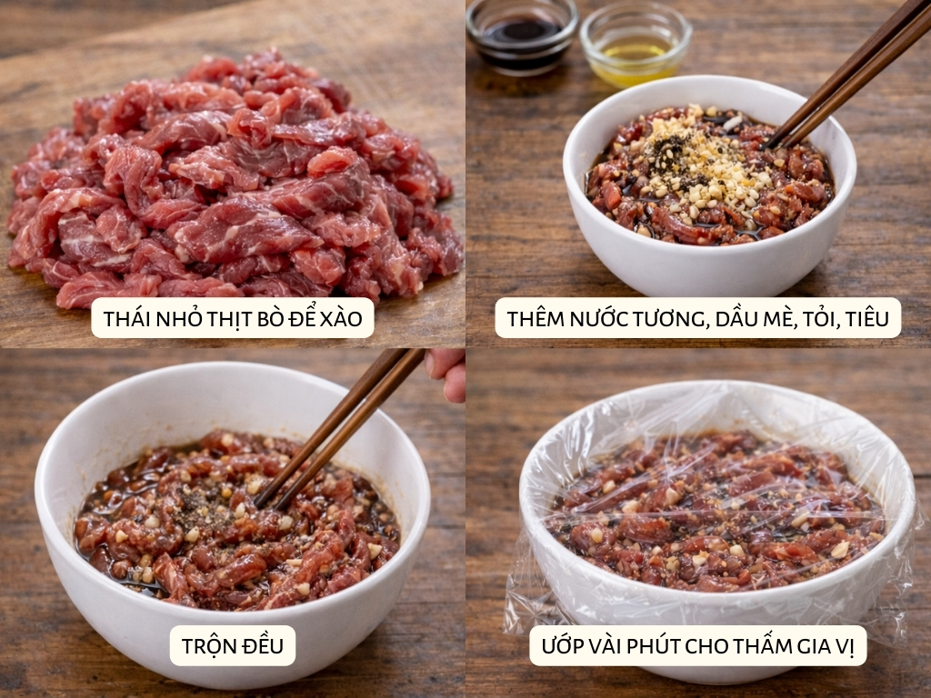 – Trộn đều, để ướp vài phút cho thịt thấm gia vị.
