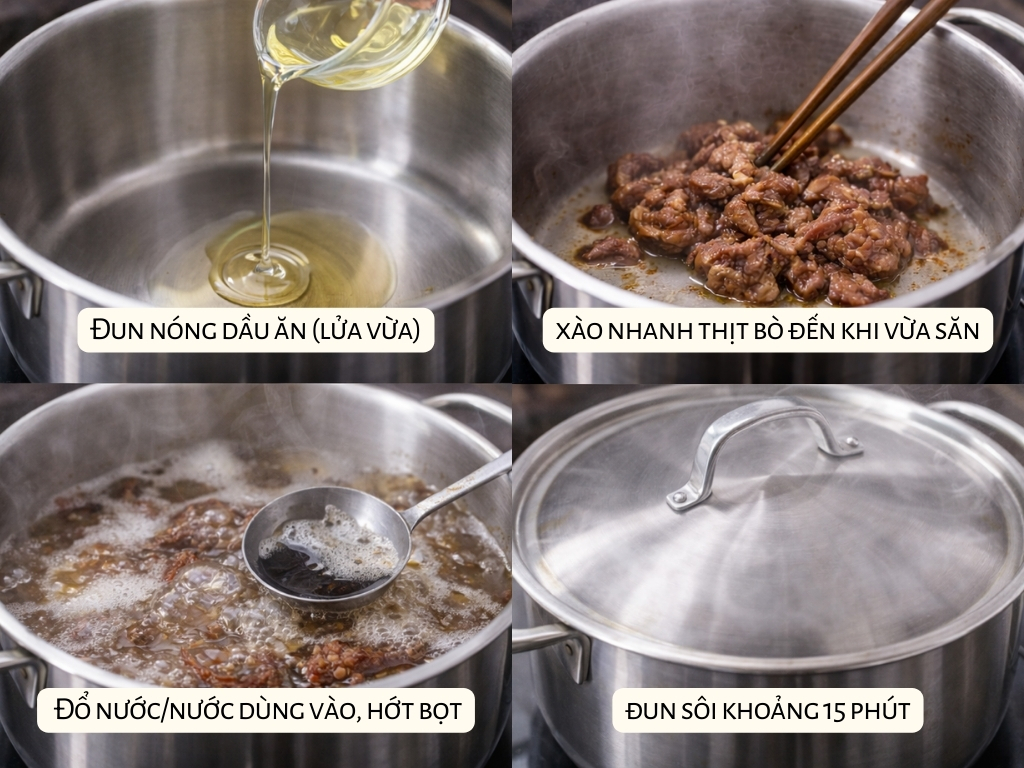 – Cho thịt bò vào xào nhanh 1–2 phút đến khi vừa săn.