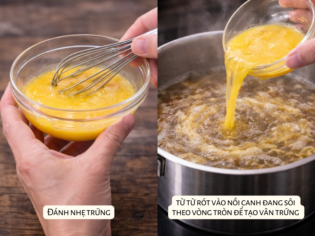 – Từ từ rót vào nồi canh đang sôi nhẹ theo vòng tròn để tạo vân trứng đẹp mắt.