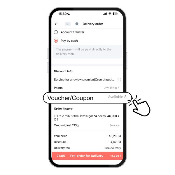 - Scroll down to the “Discount Info” section and tap “Voucher/Coupon” to apply your voucher.