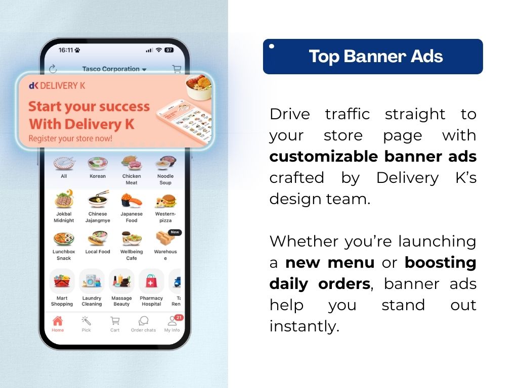 To stand out in a competitive marketplace, strategic placement and advertising are essential. Delivery K offers premium options designed to put your store directly in front of thousands of potential customers.