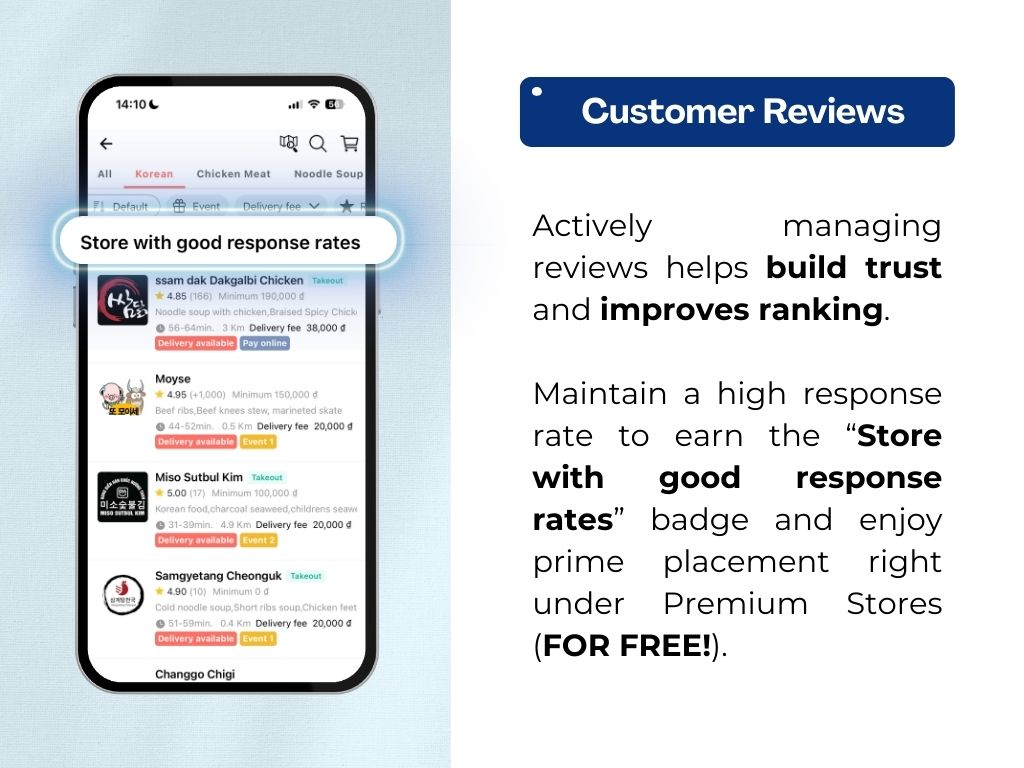 - Proactive Customer Reviews Management: Merchant Partners should respond promptly and professionally to all customer feedback (both positive and negative). By consistently maintaining an excellent response rate, your store will automatically earn the “Store with good response rates” badge. This badge is a powerful trust signal and automatically qualifies your store for prime placement on the app (right under Premium Stores) at absolutely no cost to you.