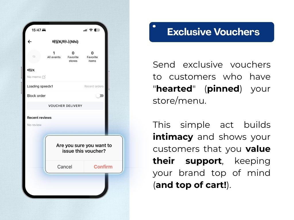 - Boost Loyalty: Send exclusive vouchers to your existing customer base (e.g., “Thank You” coupons after their third order) to encourage repeat purchases and build intimacy.