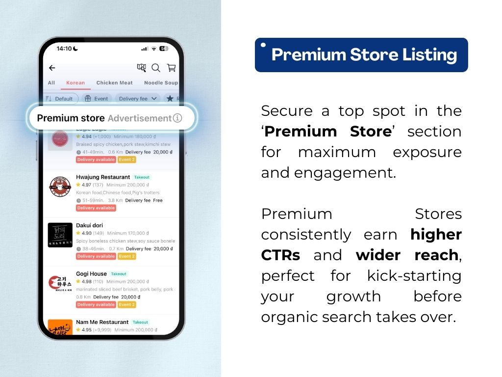 - Premium Store Listing: Secure one of the coveted top spots on category screens. This exclusive placement is reserved for our Premium Stores and is the single most effective way to maximize immediate visibility and engagement. Stores with a Premium Listing typically see a significant uplift in traffic, page views and orders compared to standard listings.