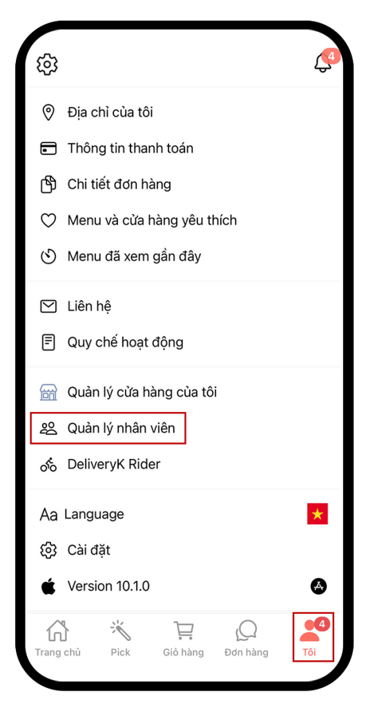 Bước 1: Tại trang chủ app, vào Tôi > Quản lý nhân viên