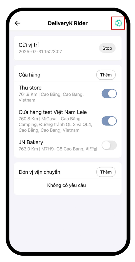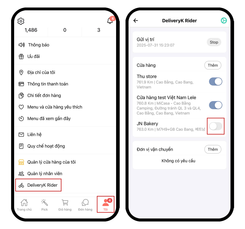 Bước 1: Tại trang chủ app, vào Tôi > DeliveryK Rider > Nhấn vào biểu tượng Bật/Tắt tại cửa hàng muốn cấp quyền cho phép theo dõi trạng thái hoạt động