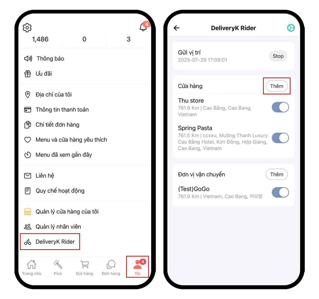 Bước 1: Tại trang chủ app, vào Tôi > DeliveryK Rider > Tại mục Cửa hàng, nhấn Thêm