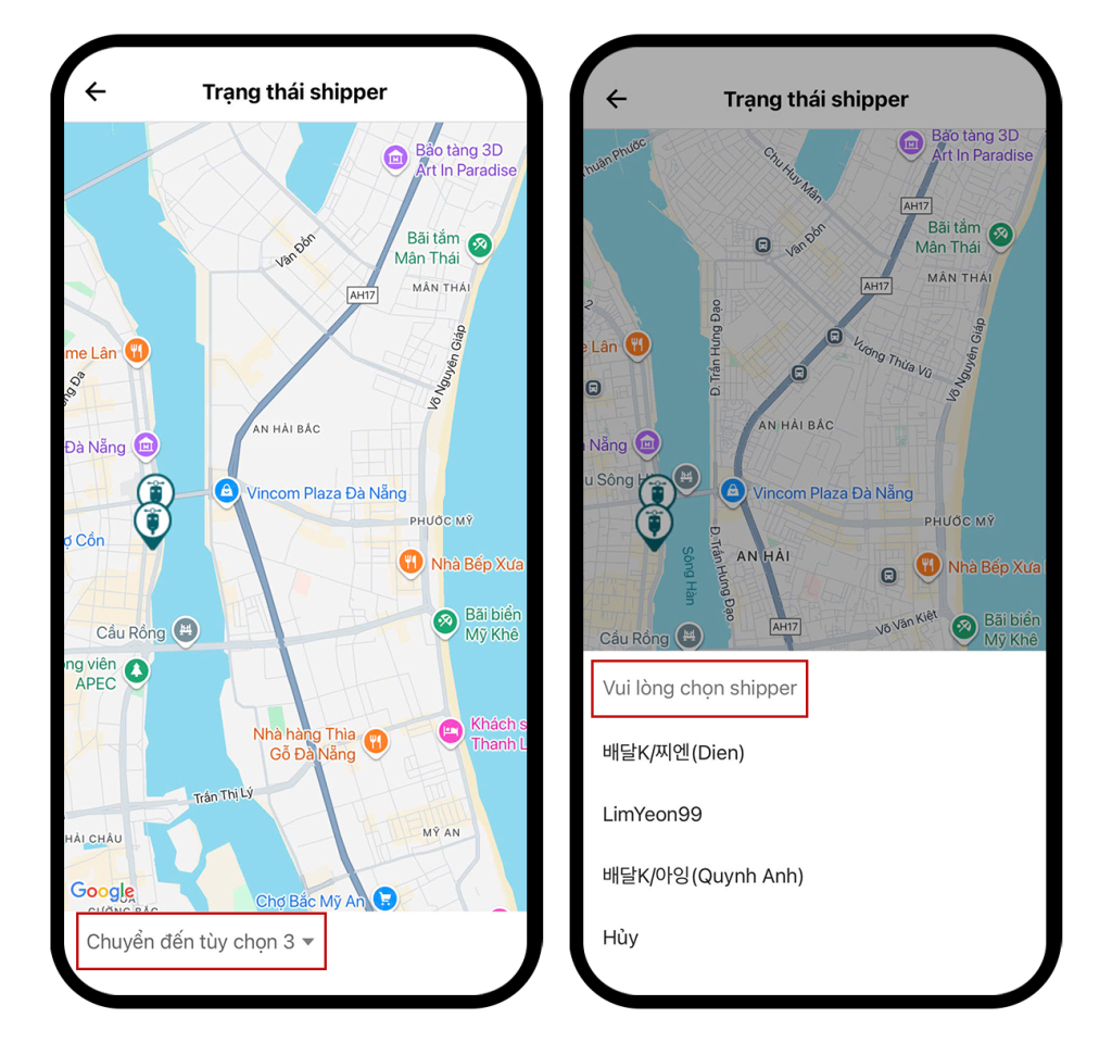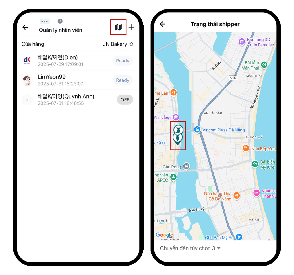 Nhấn vào “Chuyển đến tùy chọn” để lựa chọn xem vị trí của từng nhân viên (shipper) quản lý