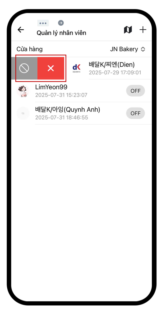 Tại Tài khoản nhân viên > Kéo trượt sang phải > nhấn vào biểu tượng dấu cấm màu xám để hủy phê duyệt và nhấn vào biểu tượng dấu “X” màu đỏ để xóa