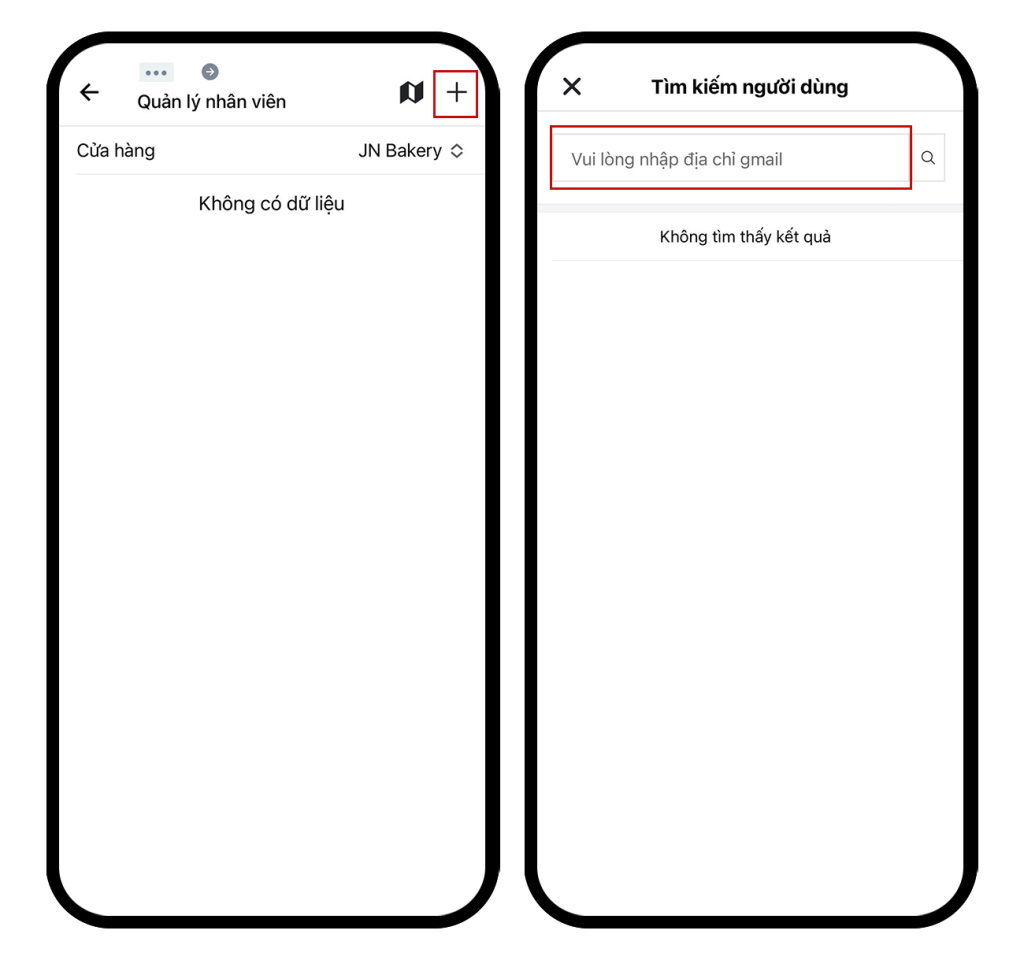 Bước 3: Thêm nhân viên (shipper) vào cửa hàng để quản lý. Nhấn vào dấu ‘+’ góc phải màn hình > Nhập thông tin gmail của nhân viên (gmail nhân viên sử dụng đăng ký tài khoản trên ứng dụng Delivery K)