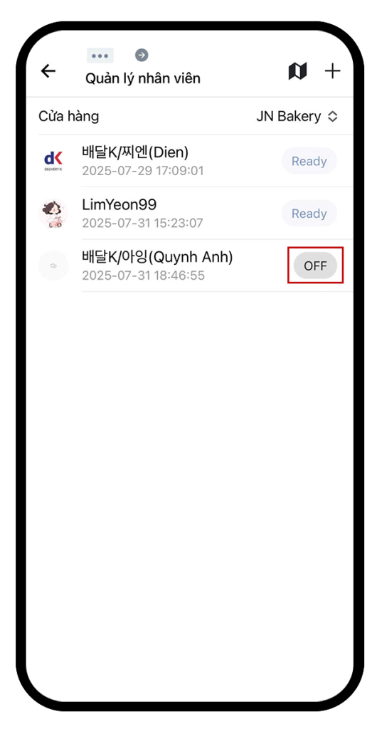 *Lưu ý: Sau khi Chủ cửa hàng thêm tài khoản nhân viên (shipper), hệ thống sẽ mặc định OFF (Tắt) trạng thái hoạt động nhân viên vừa thêm vào.