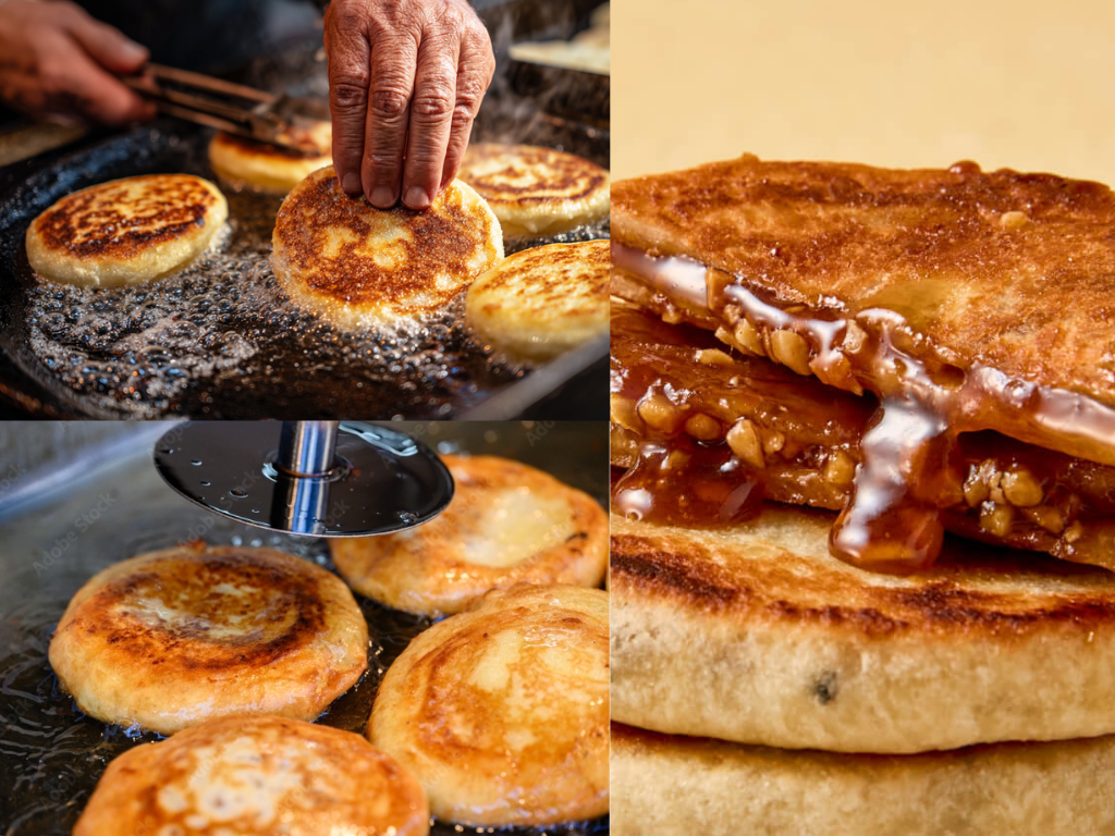 Hotteok là bánh bột chiên vàng ruộm, bên trong là hỗn hợp đường nâu, quế tan chảy thành lớp siro sánh mịn và các loại hạt như hạt bí, hạt thông. Vừa lấy khỏi chảo là nóng ‘bỏng tay’ — nhưng cắn một miếng là thấy hoàn toàn xứng đáng.
